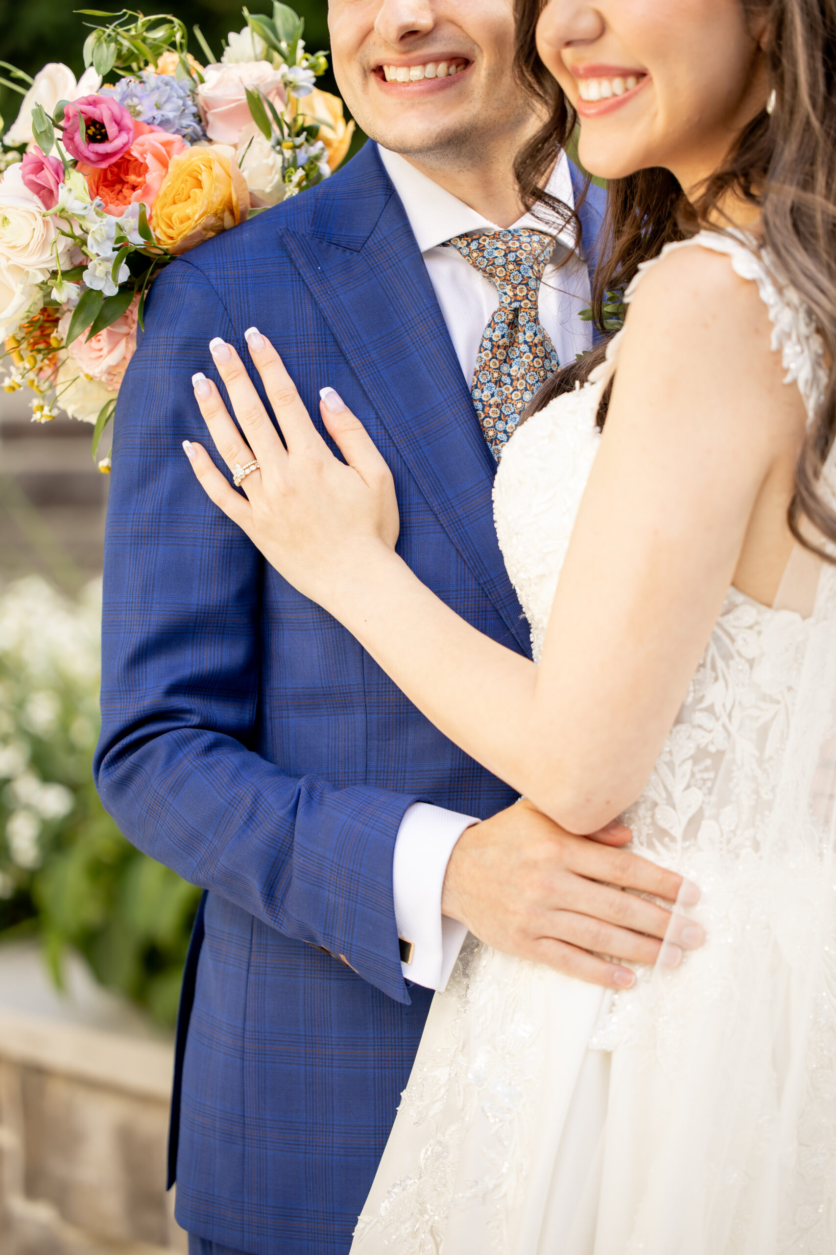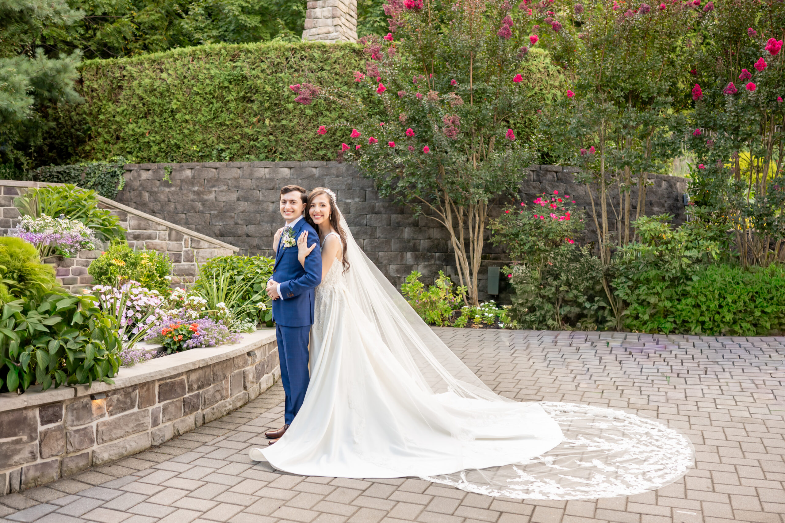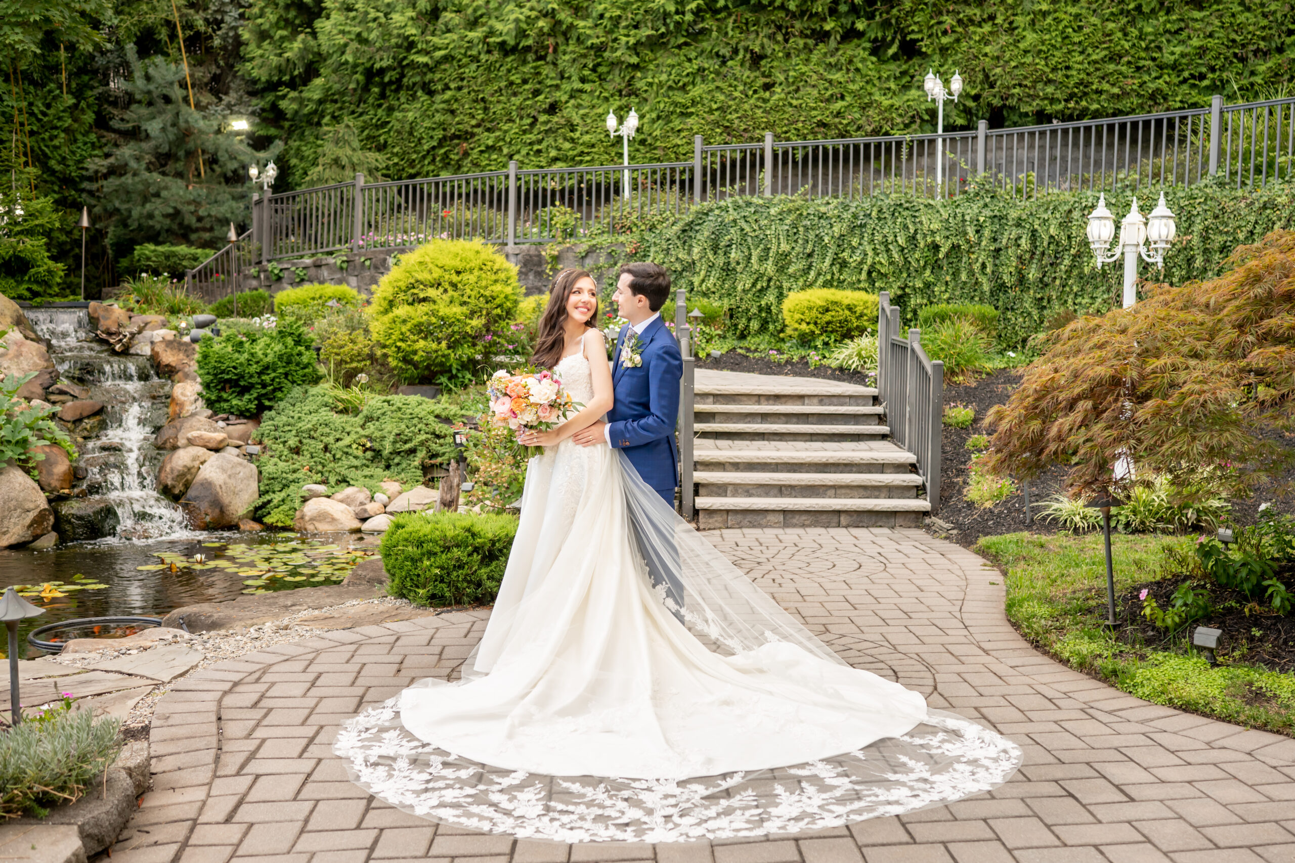 Victoriaās long lace-trimmed veil flowed beautifully behind her while her satin train laid so elegantly across the stone pathways. Mikeās bold blue suit paired perfectly with his floral tie, adding a fun pop of color that matched the joyful style of the day. This part of their Valley Regency wedding felt peaceful, intimate, and full of connection.