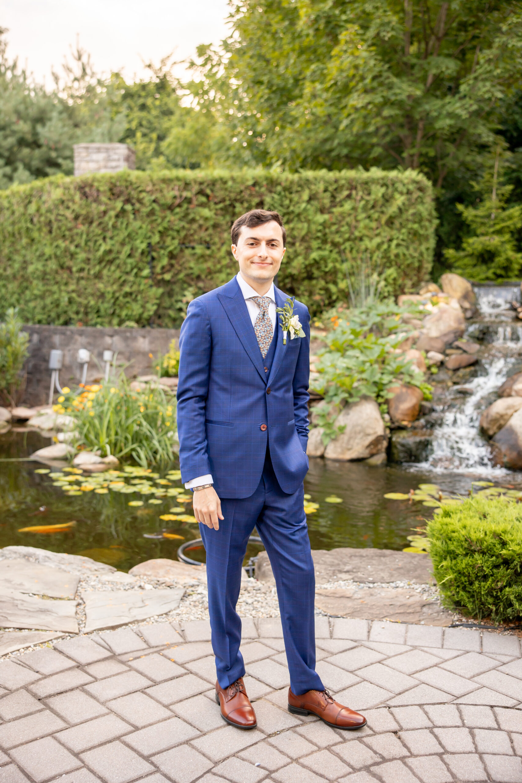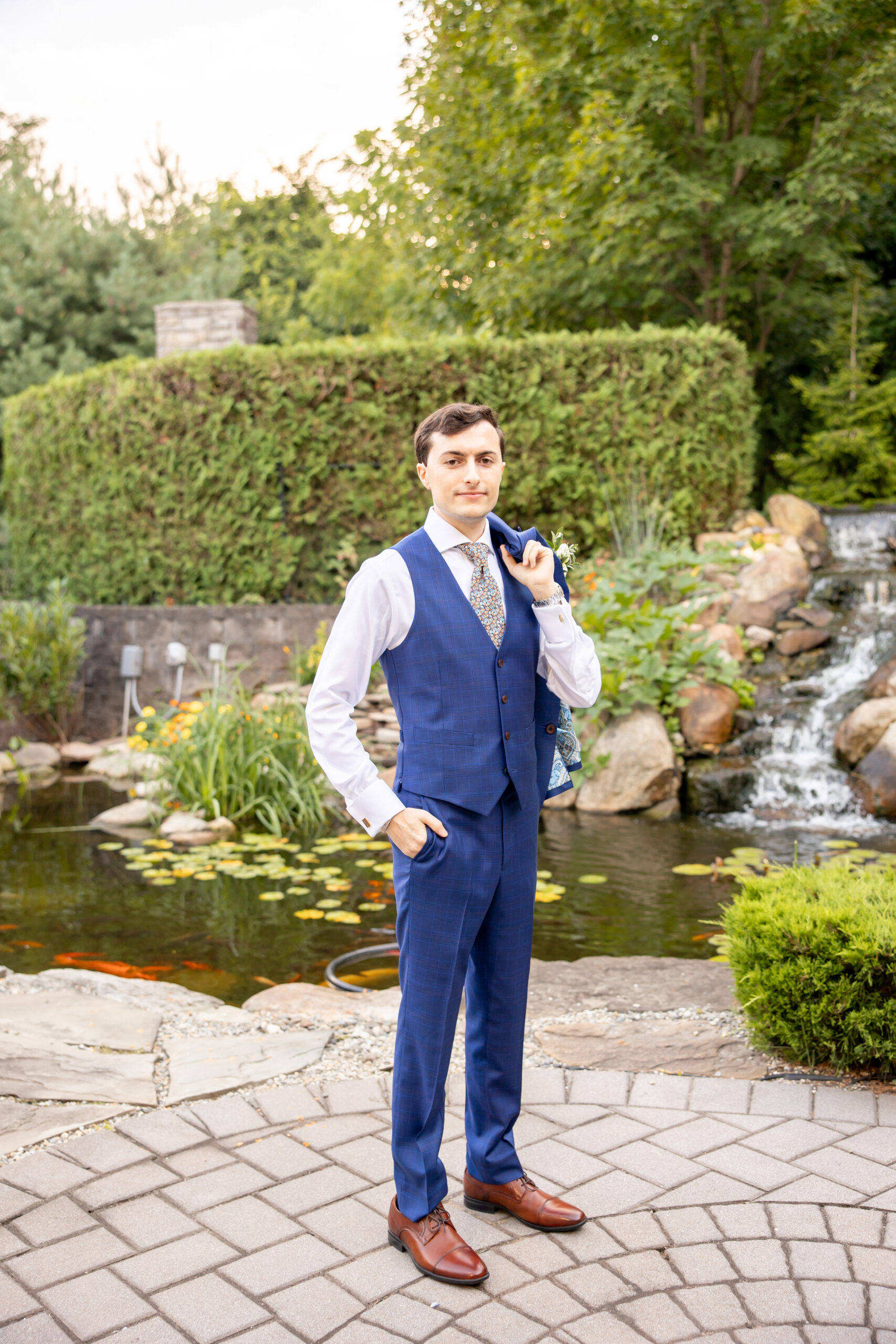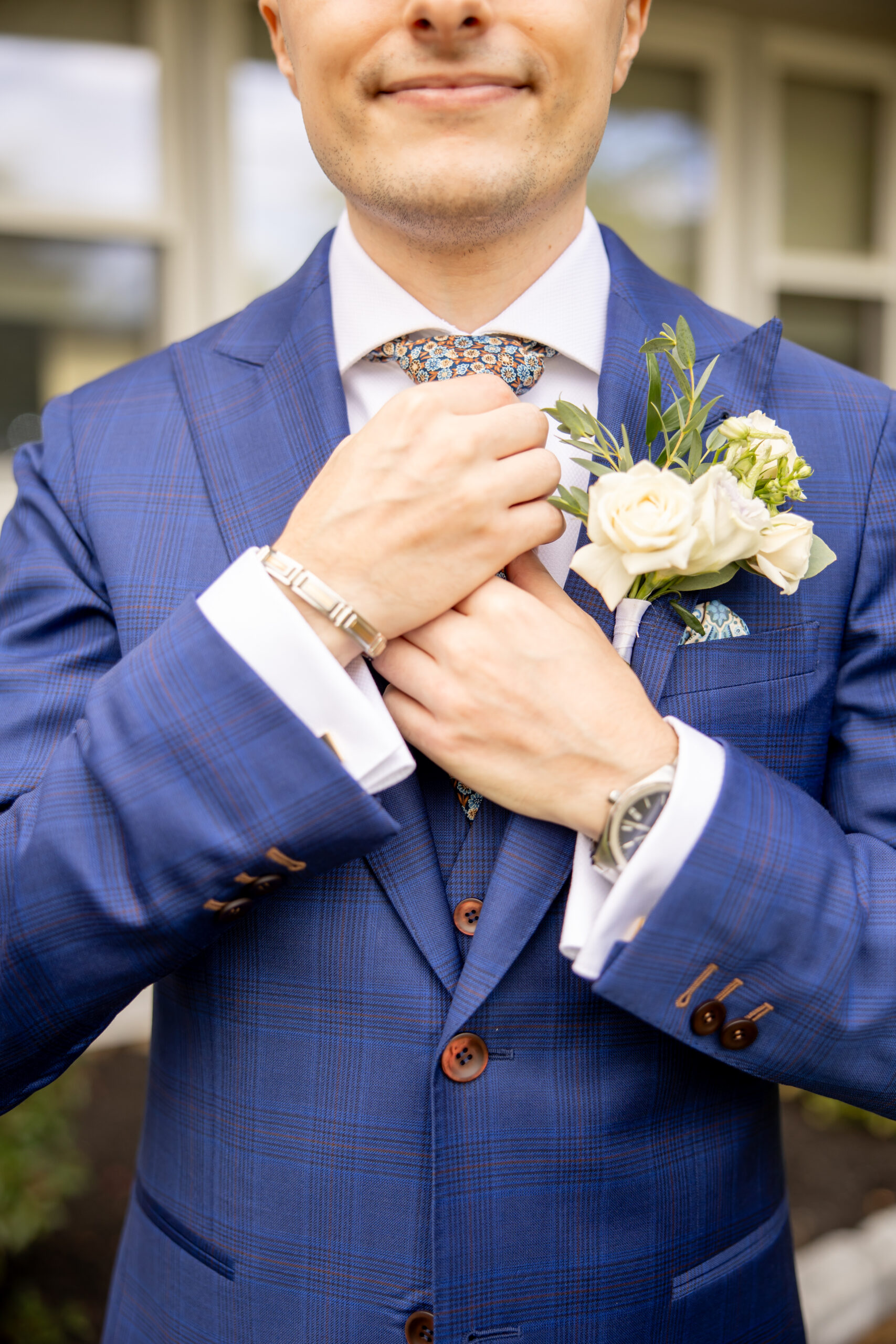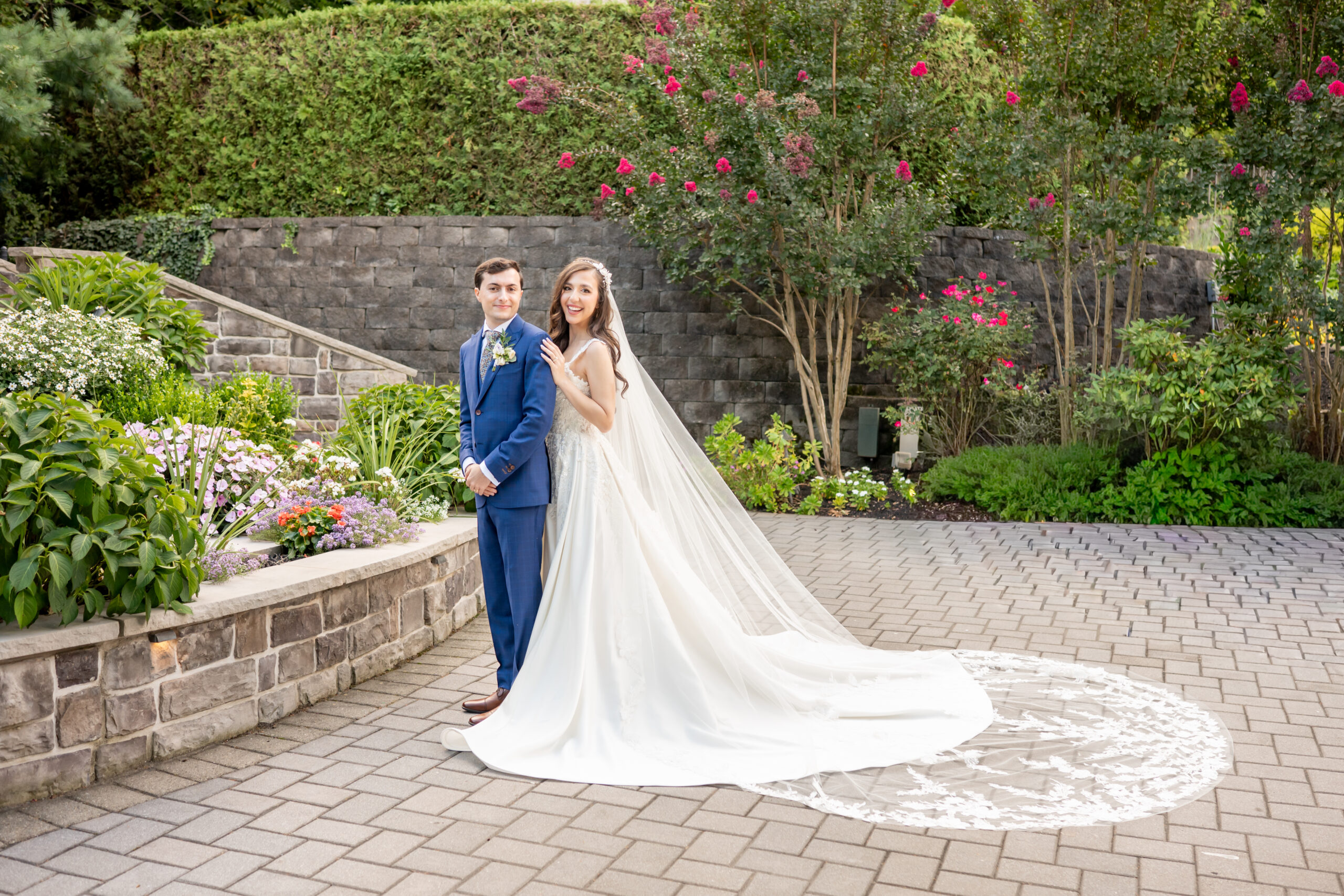 Victoriaās long lace-trimmed veil flowed beautifully behind her while her satin train laid so elegantly across the stone pathways. Mikeās bold blue suit paired perfectly with his floral tie, adding a fun pop of color that matched the joyful style of the day. This part of their Valley Regency wedding felt peaceful, intimate, and full of connection.