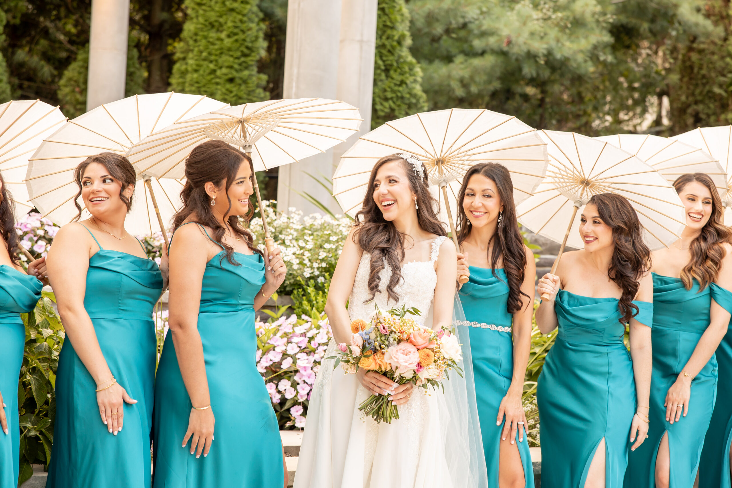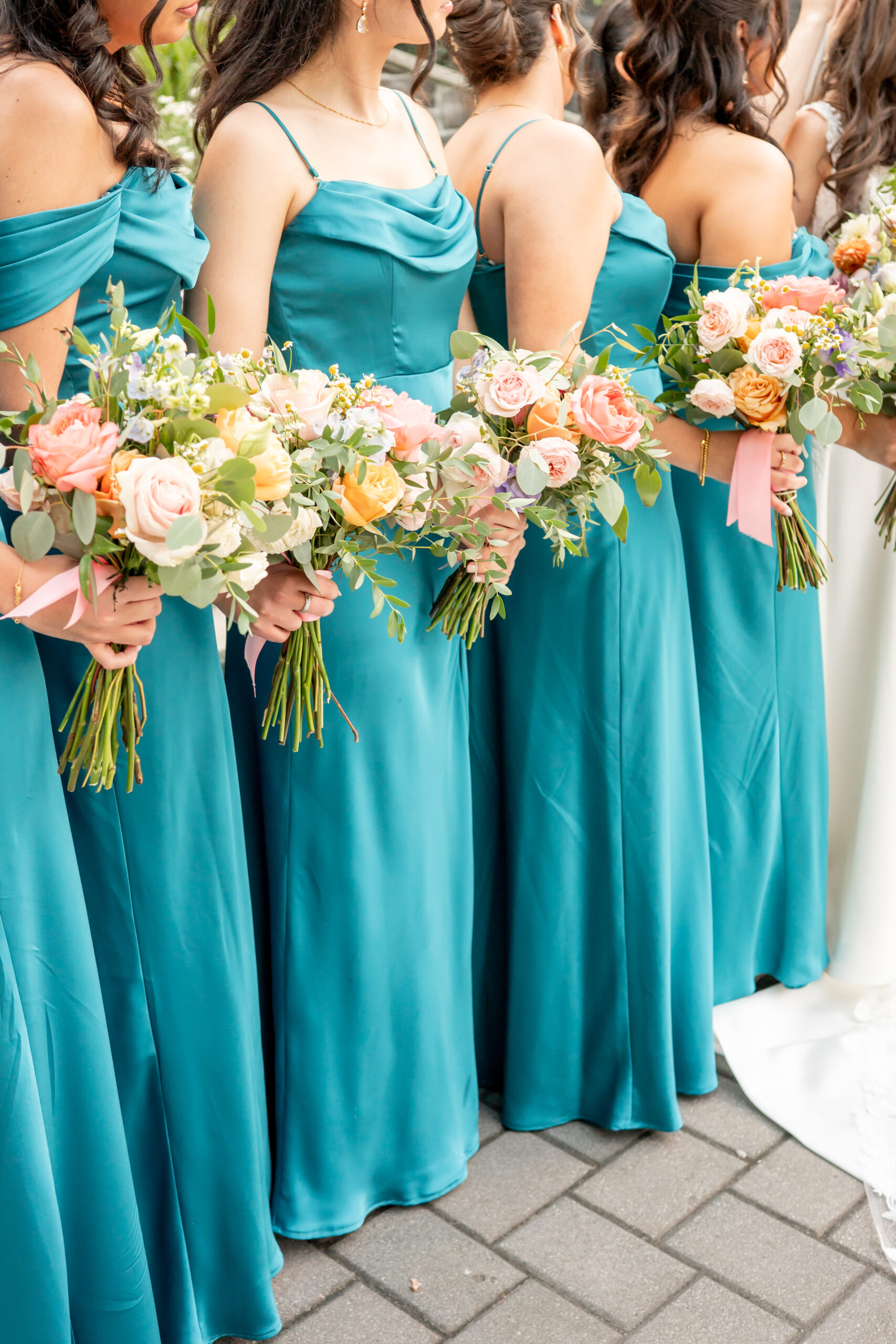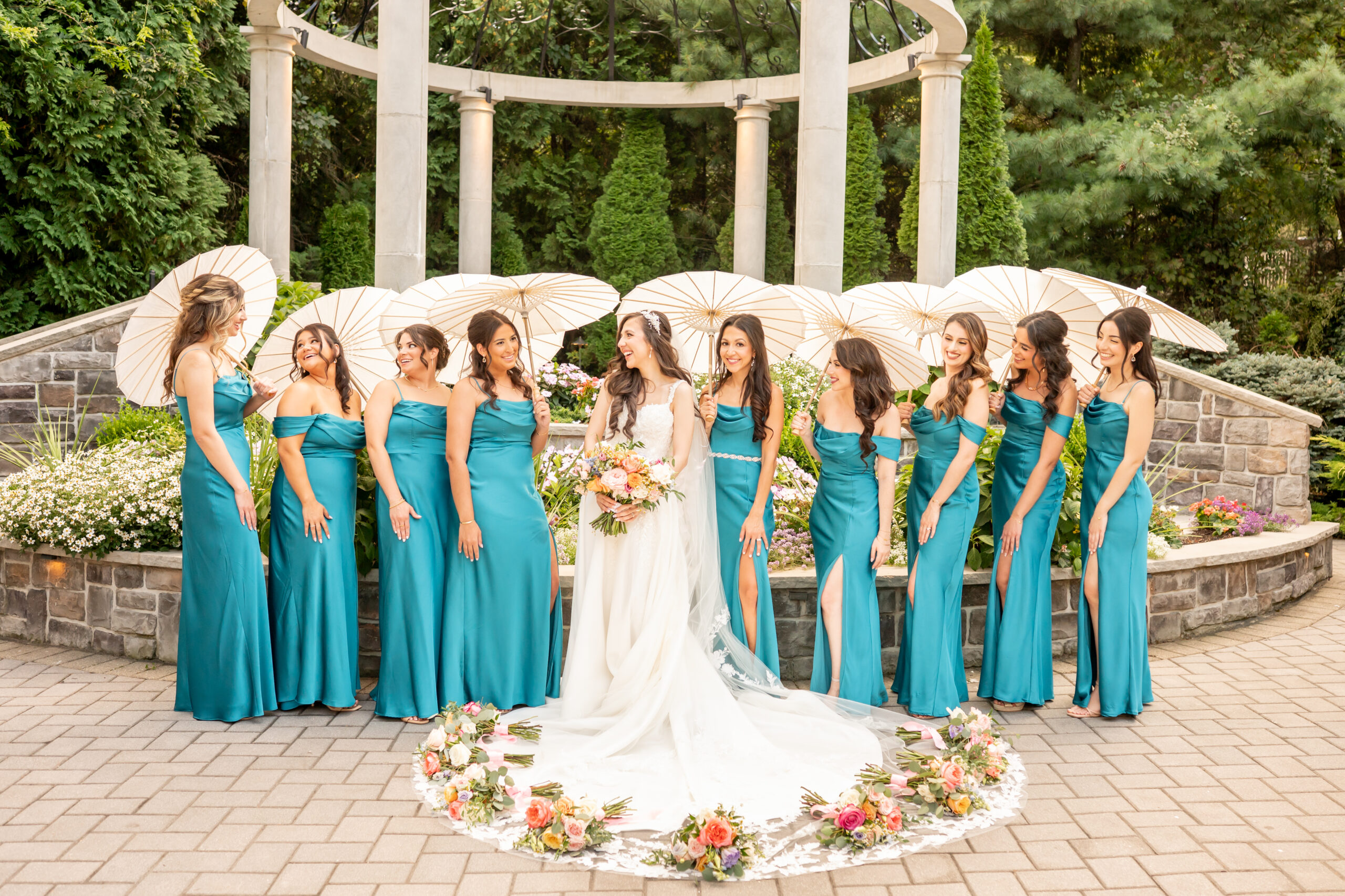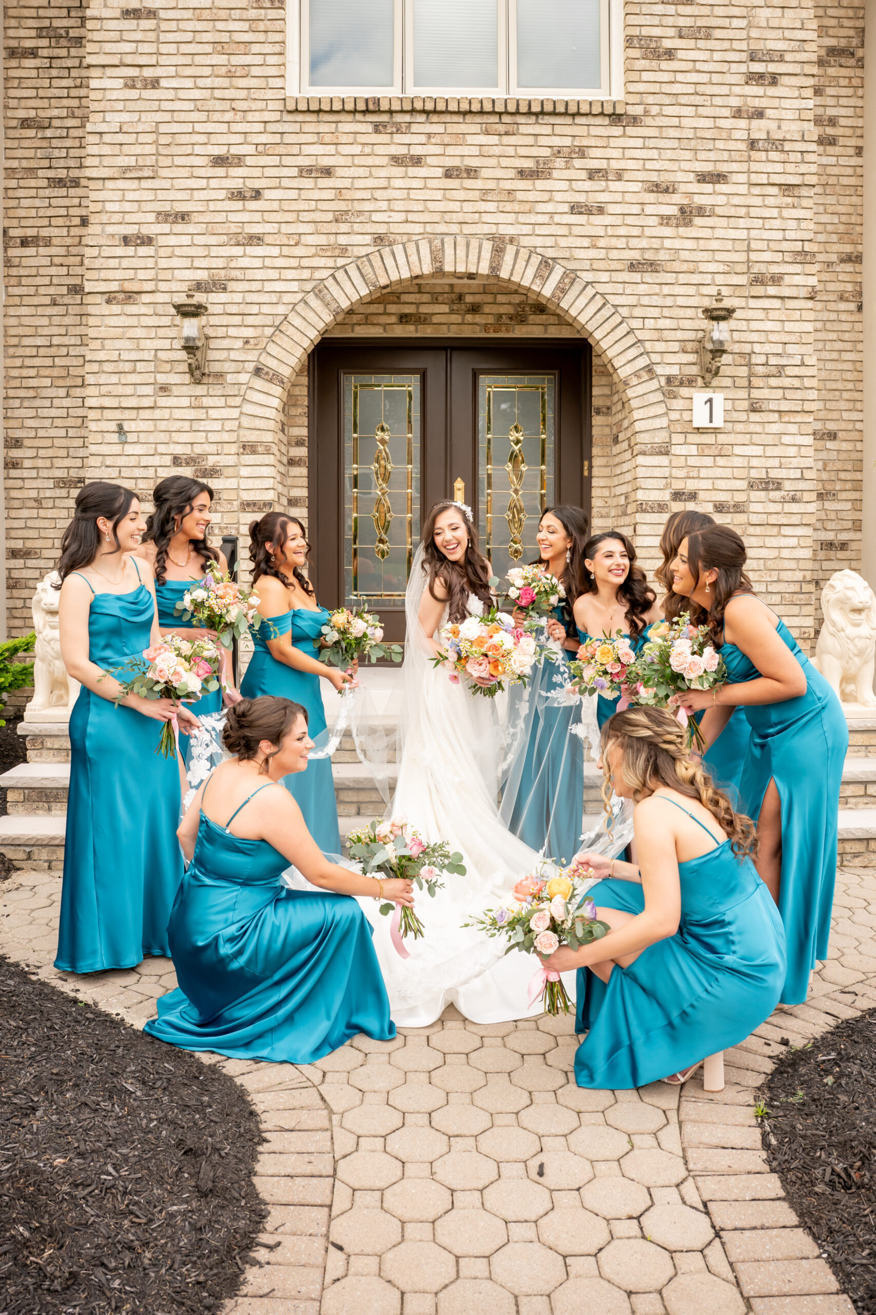The groomsmen wore soft blue suits with floral ties and brown shoes, while the bridesmaids stunned in peacock green satin dresses paired with colorful bouquets. We even added playful parasols for fun, lighthearted photos. One especially touching moment was recreating a photo from Victoriaās momās wedding day, with the bouquets arranged in a circle around Victoriaās train. When her mom saw it, she was overwhelmed with emotion. It was such a beautiful tribute.