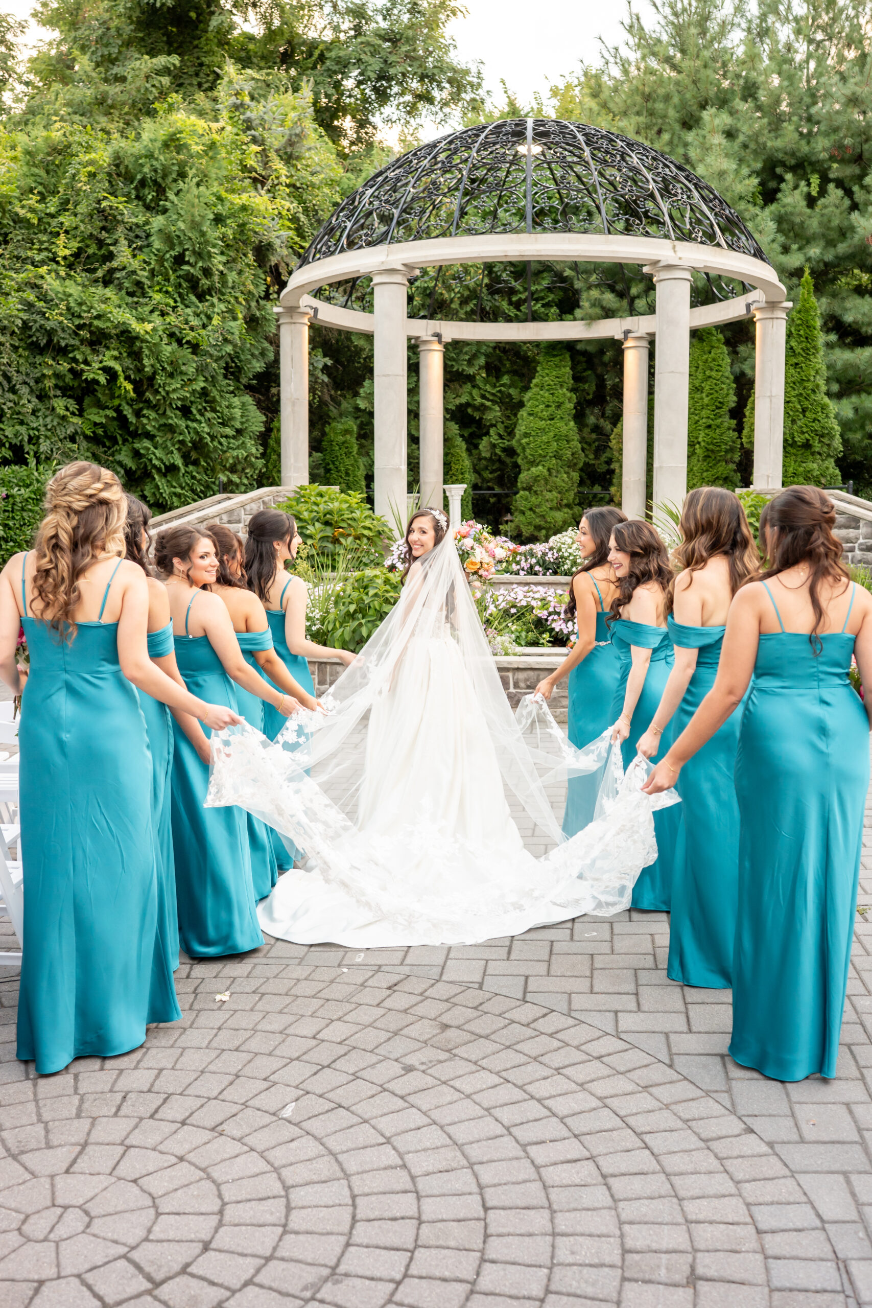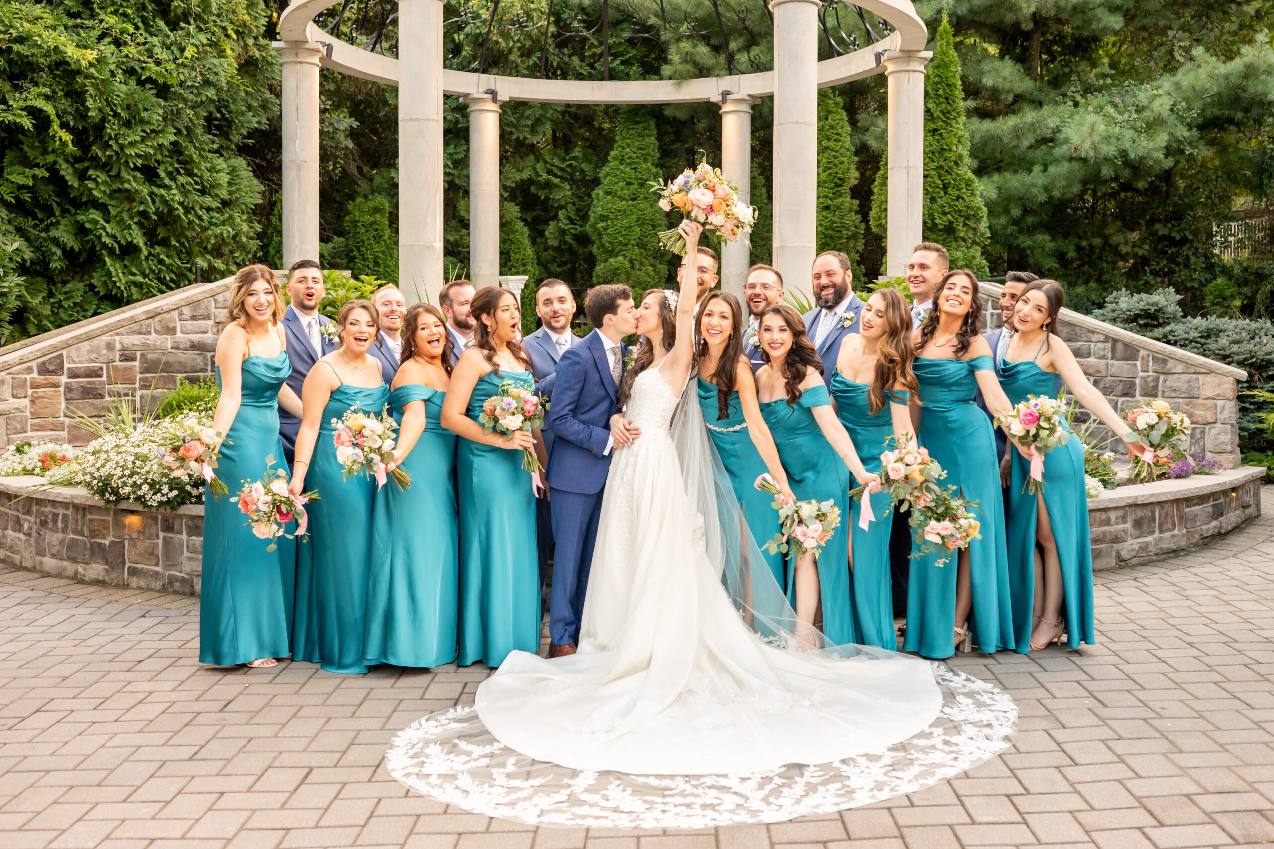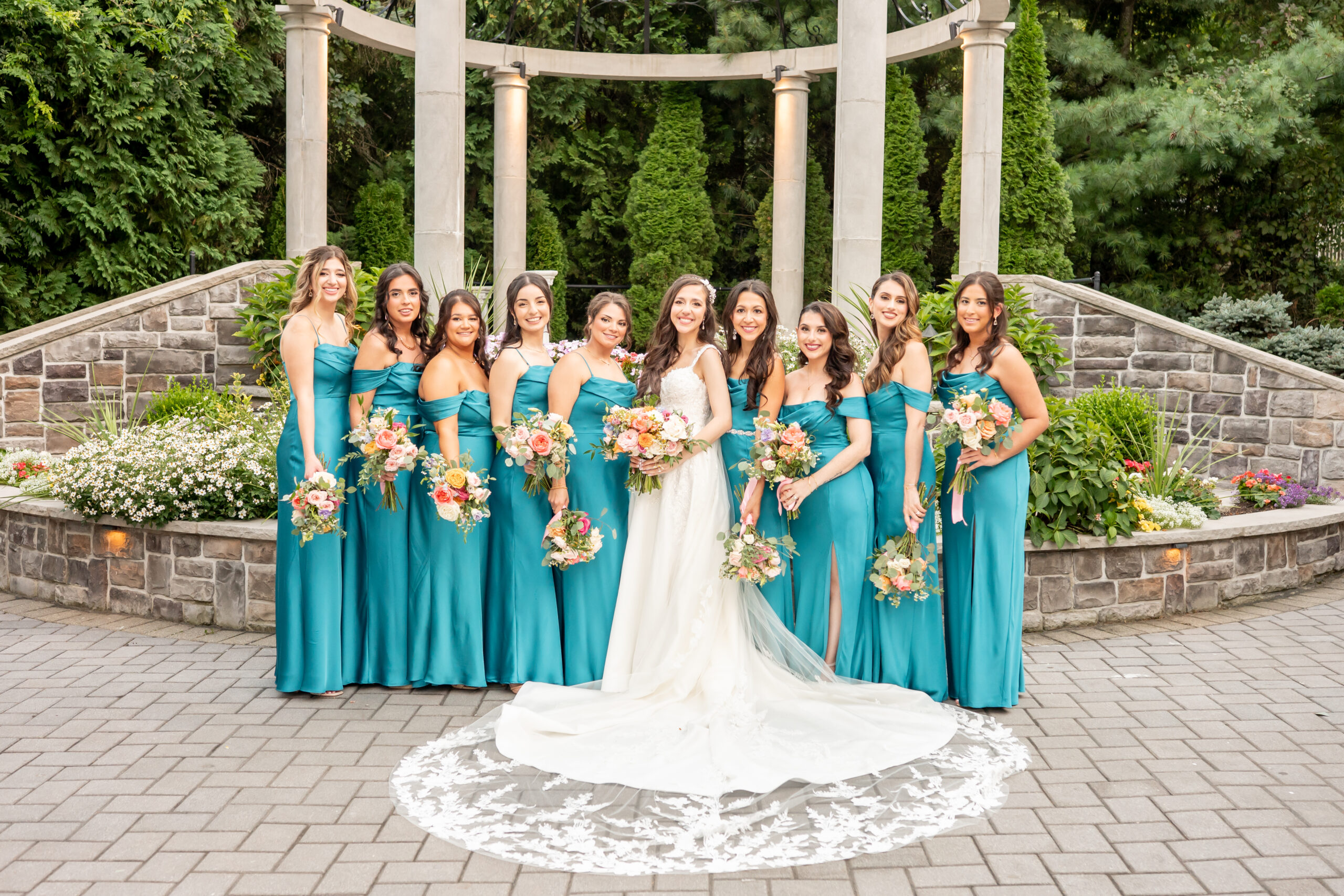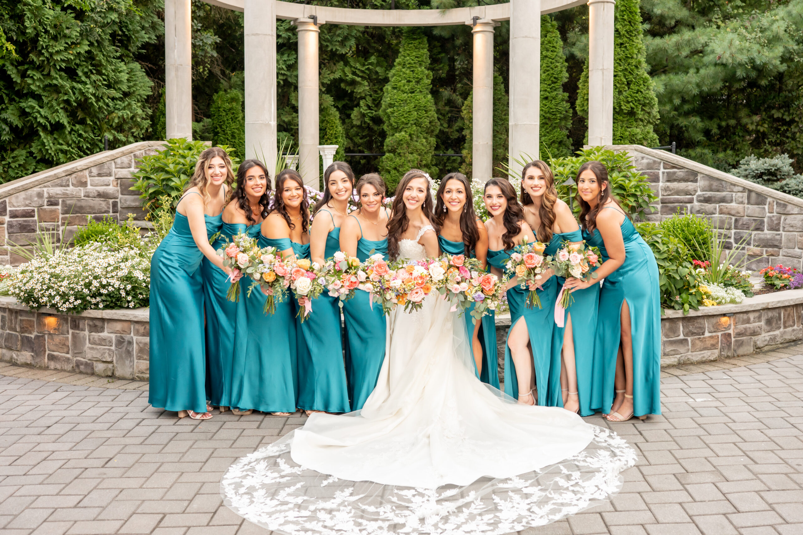 The groomsmen wore soft blue suits with floral ties and brown shoes, while the bridesmaids stunned in peacock green satin dresses paired with colorful bouquets. We even added playful parasols for fun, lighthearted photos. One especially touching moment was recreating a photo from Victoriaās momās wedding day, with the bouquets arranged in a circle around Victoriaās train. When her mom saw it, she was overwhelmed with emotion. It was such a beautiful tribute.