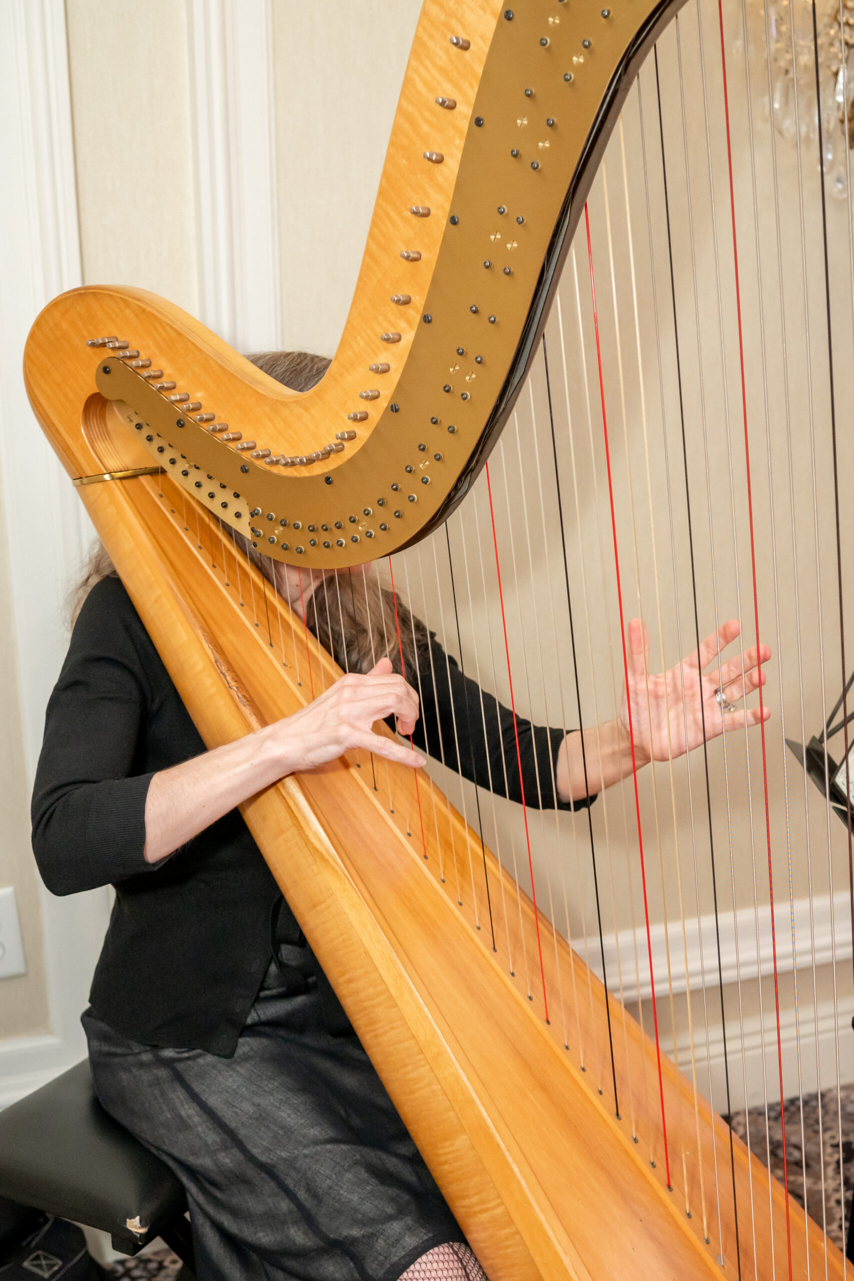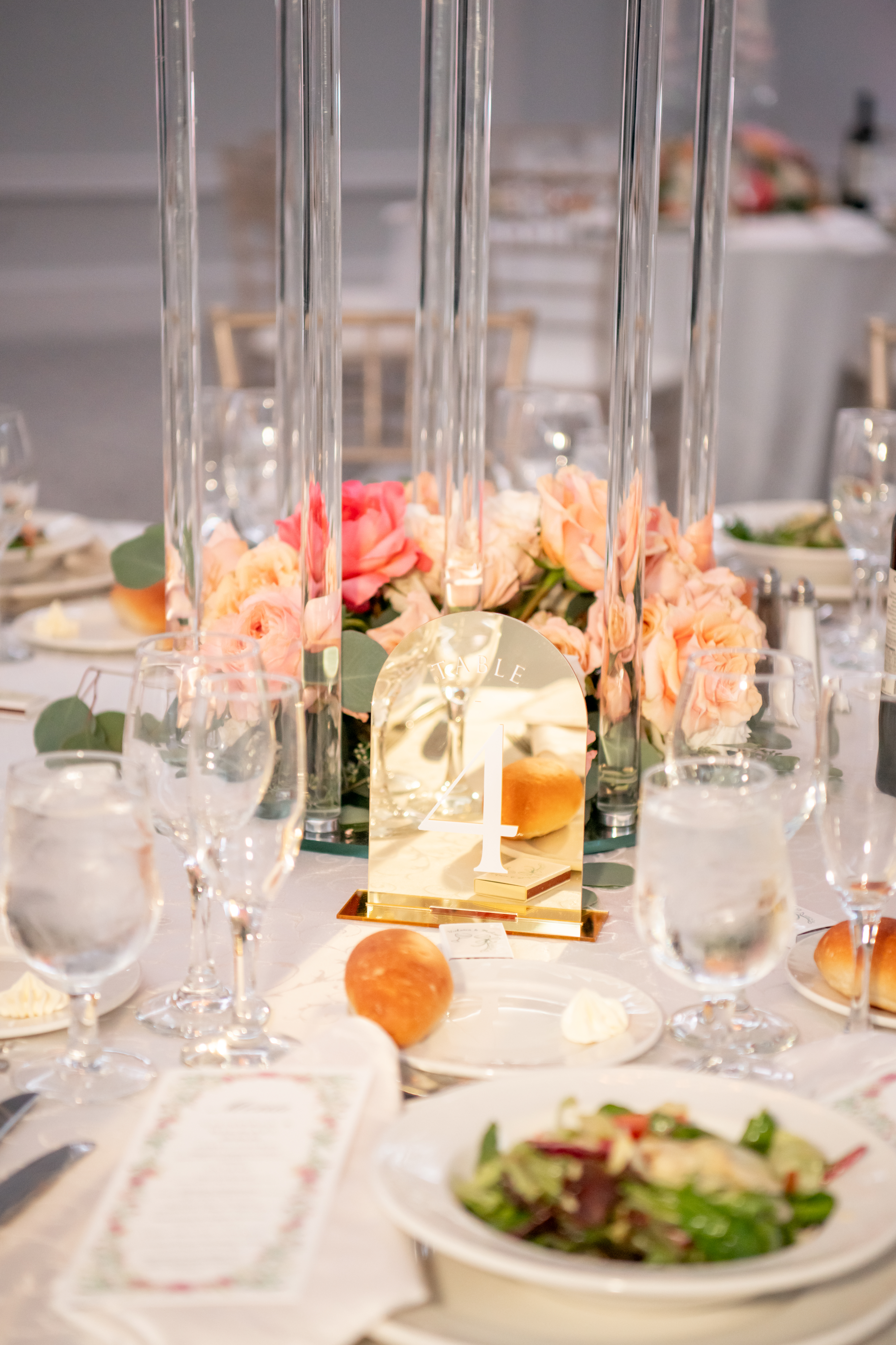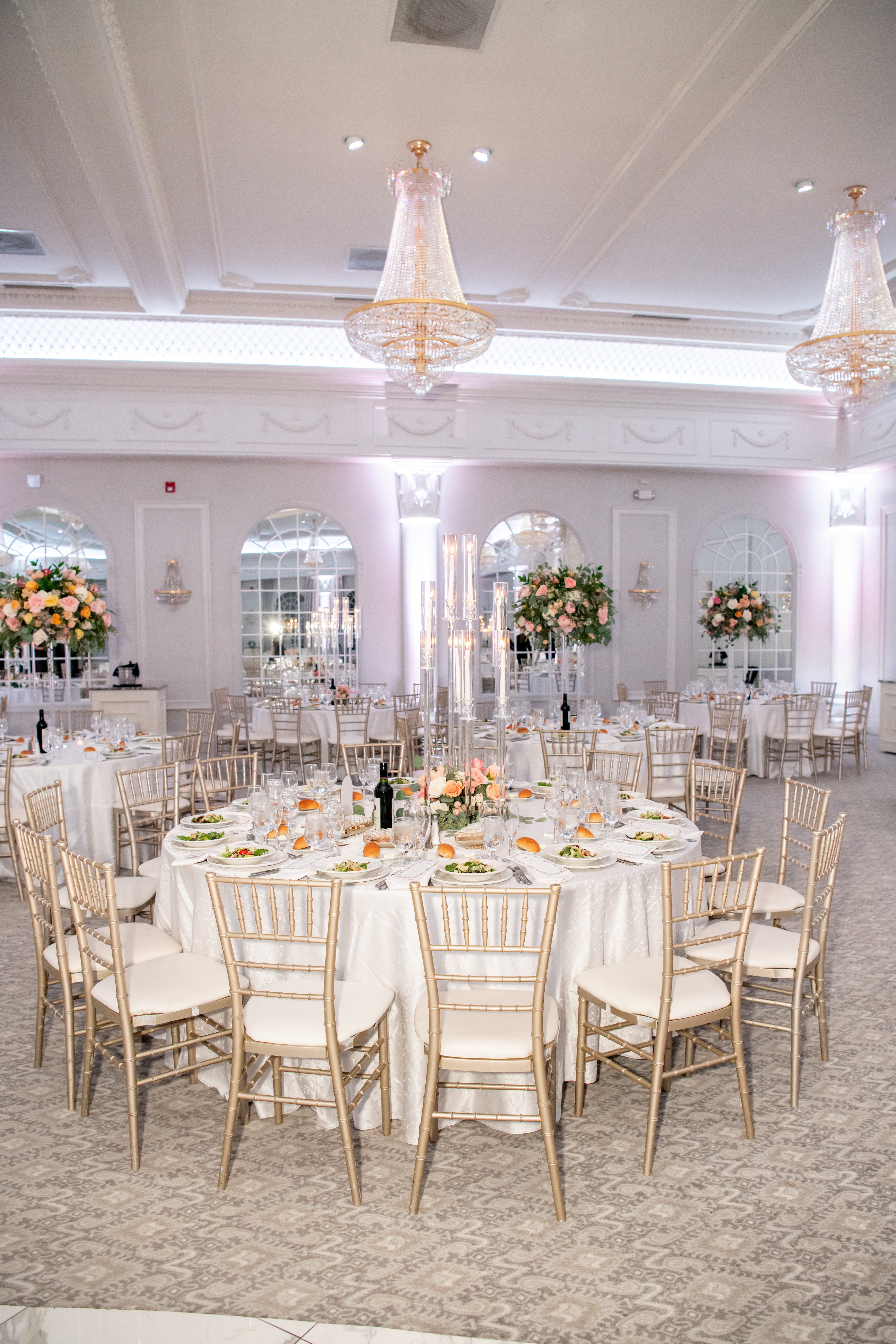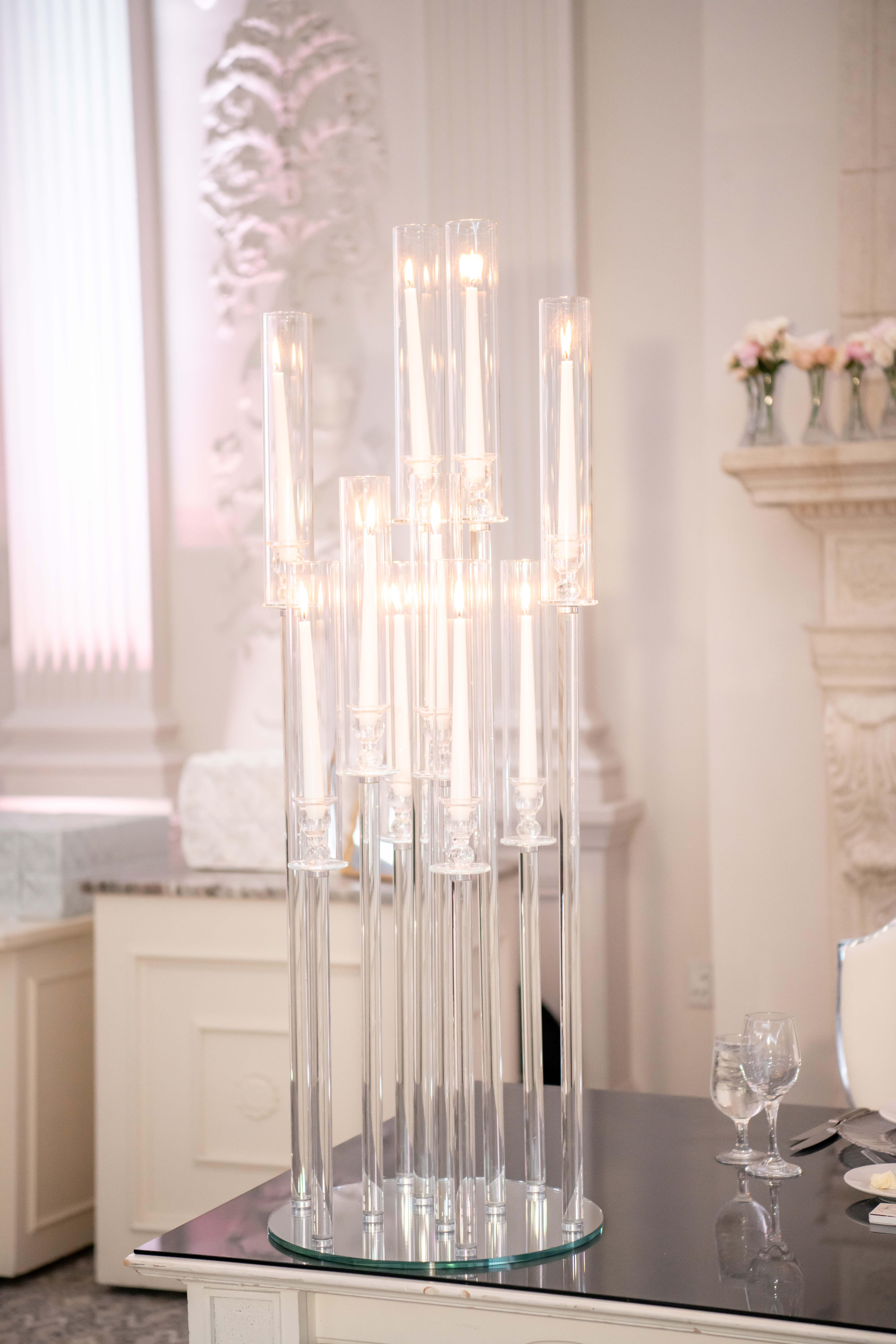 Cocktail hour began with live harp music as guests enjoyed delicious food and drinks in a relaxed, elegant atmosphere. Inside the reception space, tall glass candlesticks, floral stands, and classic candelabras created a romantic and timeless setting. The room felt warm, layered, and absolutely stunning.