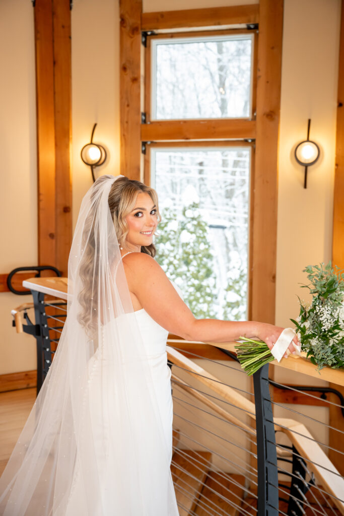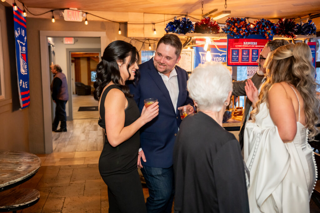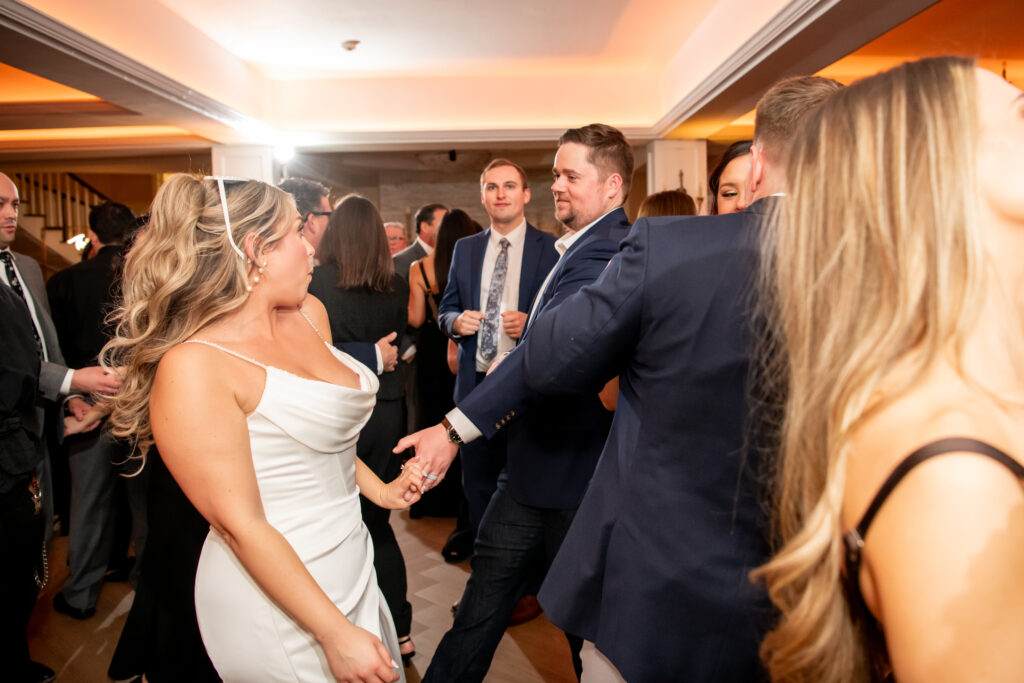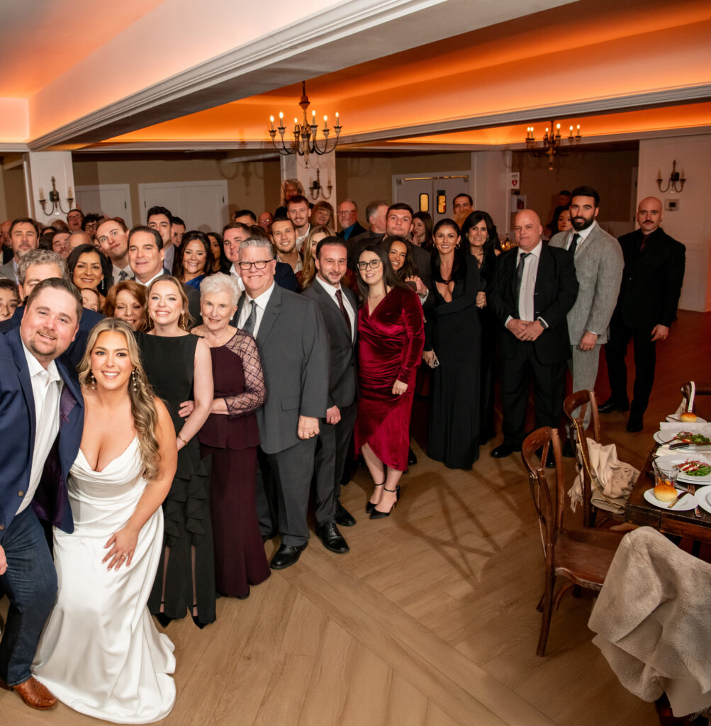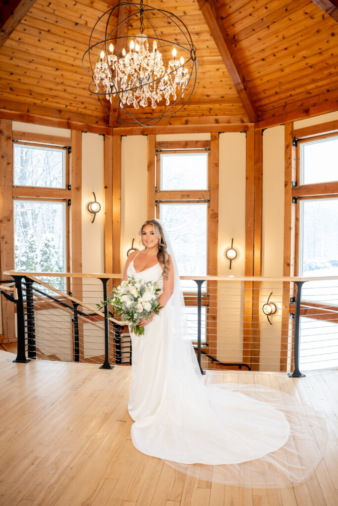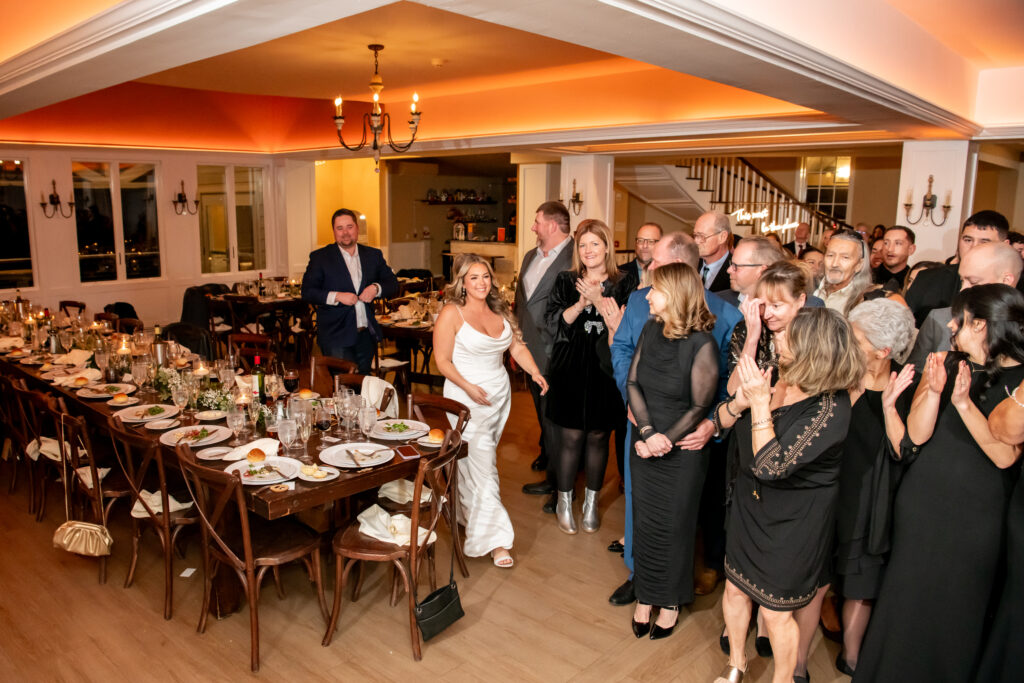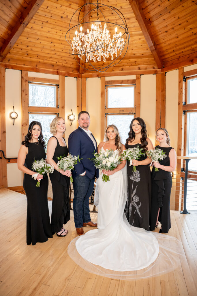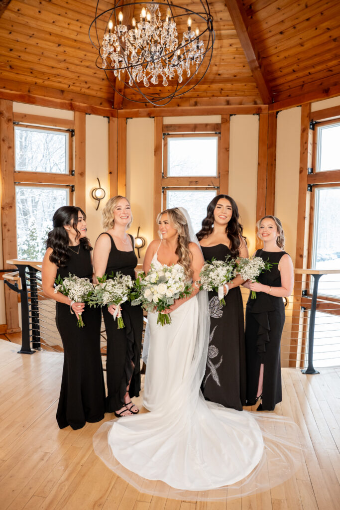 After braving the snow for photos, everyone headed inside to warm up and celebrate. The reception space felt inviting, glowing with soft lights, winter florals, and a cozy atmosphere that matched the season perfectly.